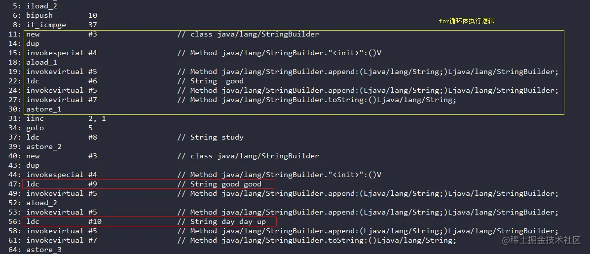 s += " good";的执行,等价于s = (new StringBuilder(s)).append(" good").toString();(PS:字节码中执行了两次append,第一次是在StringBuilder构造方法中执行) 每一次循环都会创建一个新的StringBuilder对象,这也是循环内部不要使用加号拼接字符串的原因。 - 执行语句(2),根据反编译字节码可看出,对于加号连接操作,编译器会尽可能多的将字符串常量连接起来。所以其执行逻辑等价于