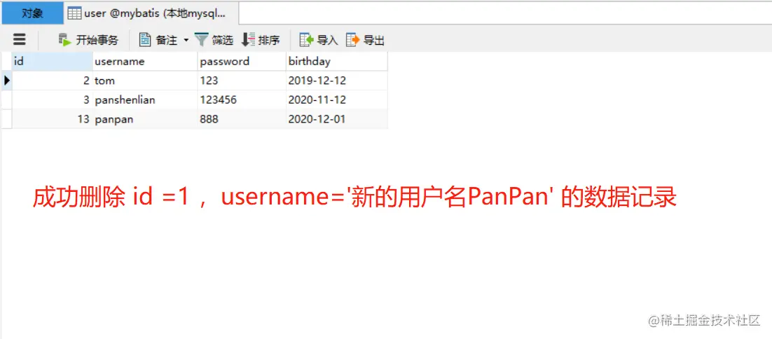 执行结果如下,成功删除 id =1 ,username=新的用户名PanPan的数据记录。