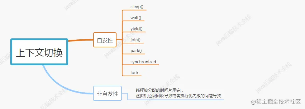 自发性上下文切换是指线程由 Java 程序调用导致切出,在多线程编程中,执行调用上图中的方法或关键字,常常就会引发自发性上下文切换。