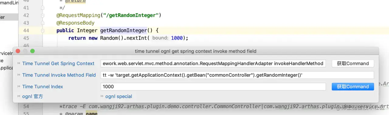这个是参考了横云断岭 的arthas 通过tt 获取spring context 为所欲为 ,可以参考这个文档:github.com/WangJi92/ar… 这里做了些什么?将整个连贯了起来,不需要记住参数信息,然后对于调用的参数进行简单的默认封装,复杂的参数场景不支持,需要手动拼接,参考上面的ognl 语法糖。