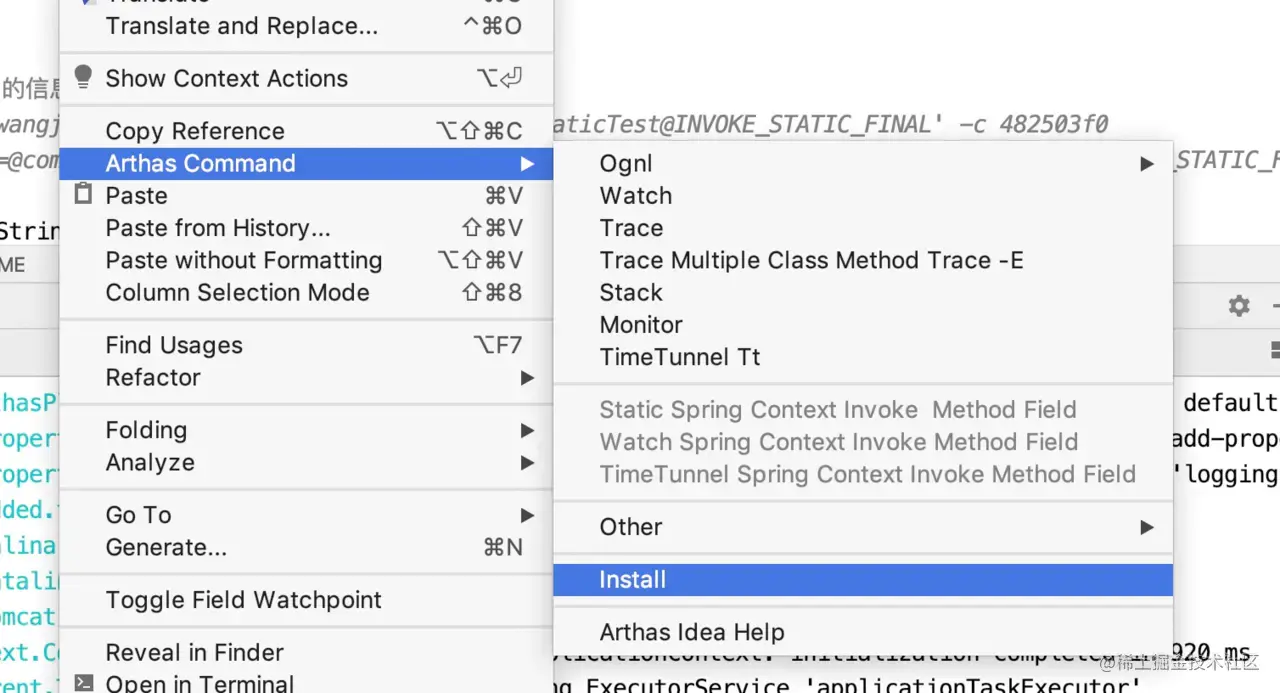 选中变量,然后右键执行命令。由于使用静态的static spring context 依然需要classloader的值.这里已经基本上是arthas的上层应用啦。