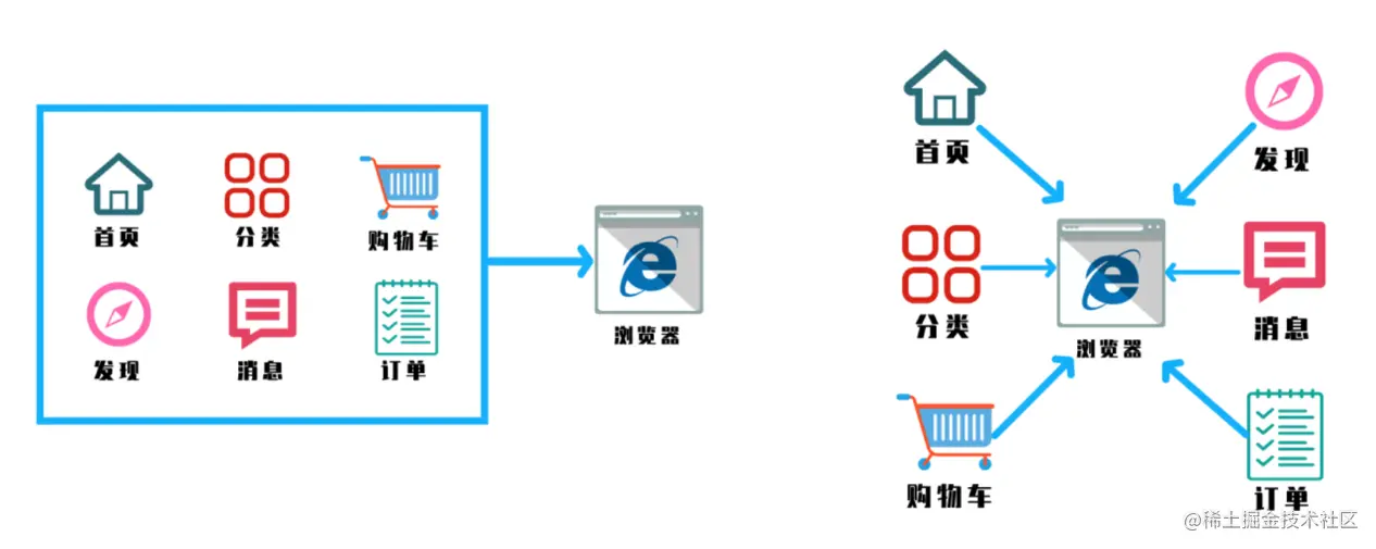 - 它将微服务的理念应用于浏览器端,即将web应用由一个大型的单体应用转变为多个小型前端应用聚合为一的应用。