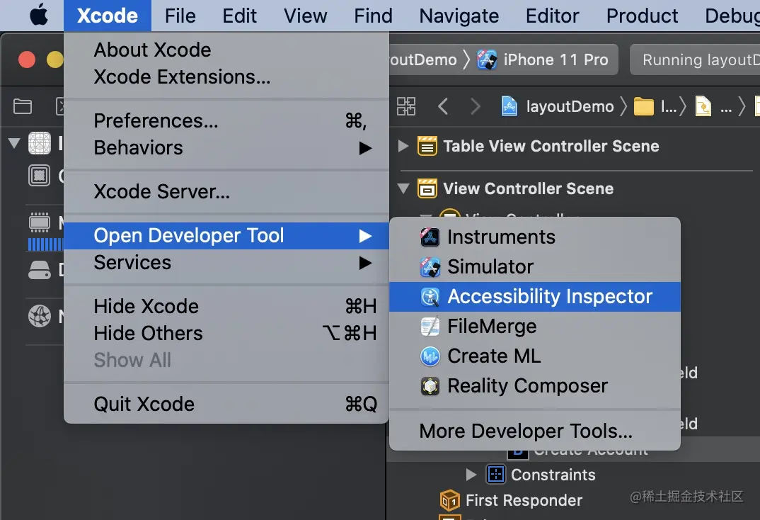 另一个是 Accessibility Inspector,在菜单栏选择 Xcode -> Open Developer Tool -> Accessibility Inspector 即可打开。