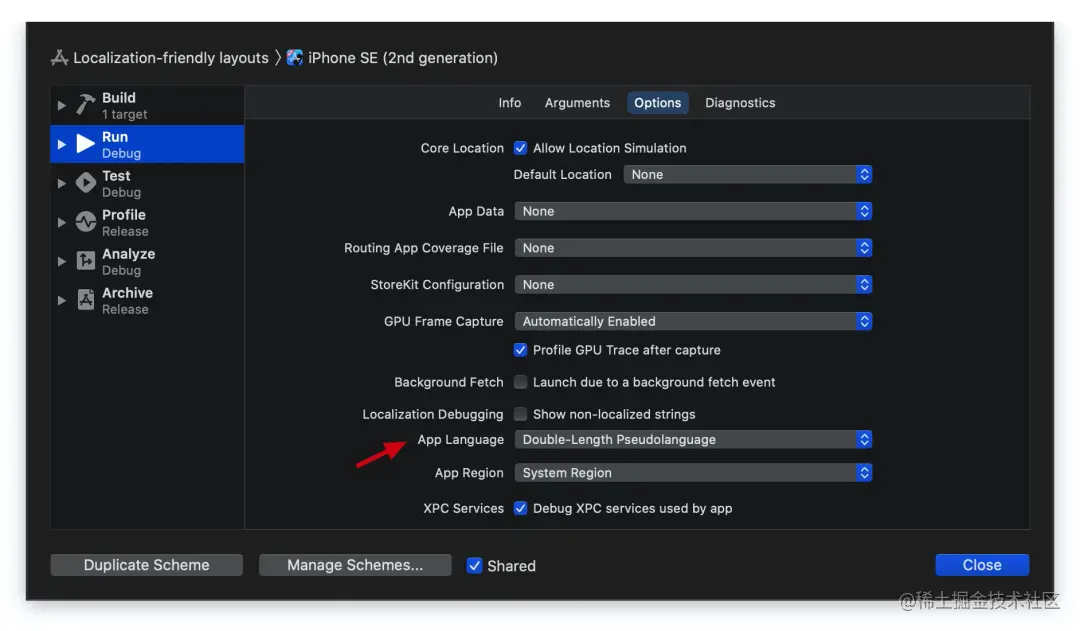 Xcode 为开发者提供了一组调试工具,可以让开发者方便地调试布局在多种语言下的表现。
