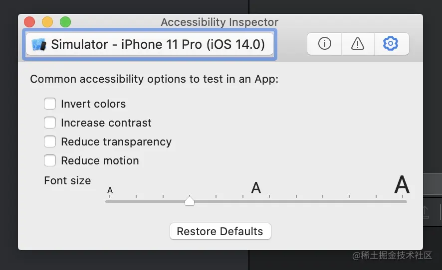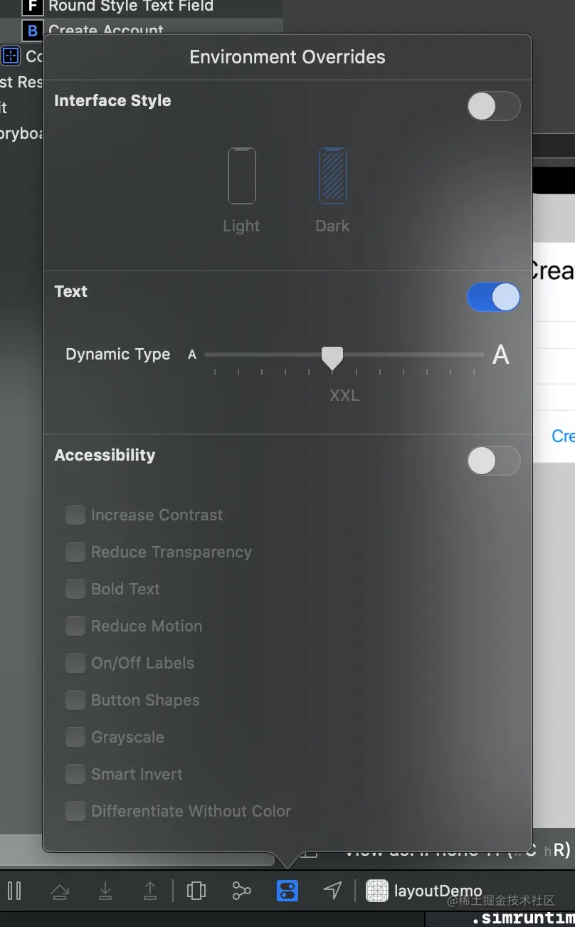 一个是 Environment Override,在启动应用调试之后可以在 Debug 窗口上面的工具栏点开。这个功能除了调试动态字体之外还可以调试 Dark Mode 和其他的 Accessibility 选项。