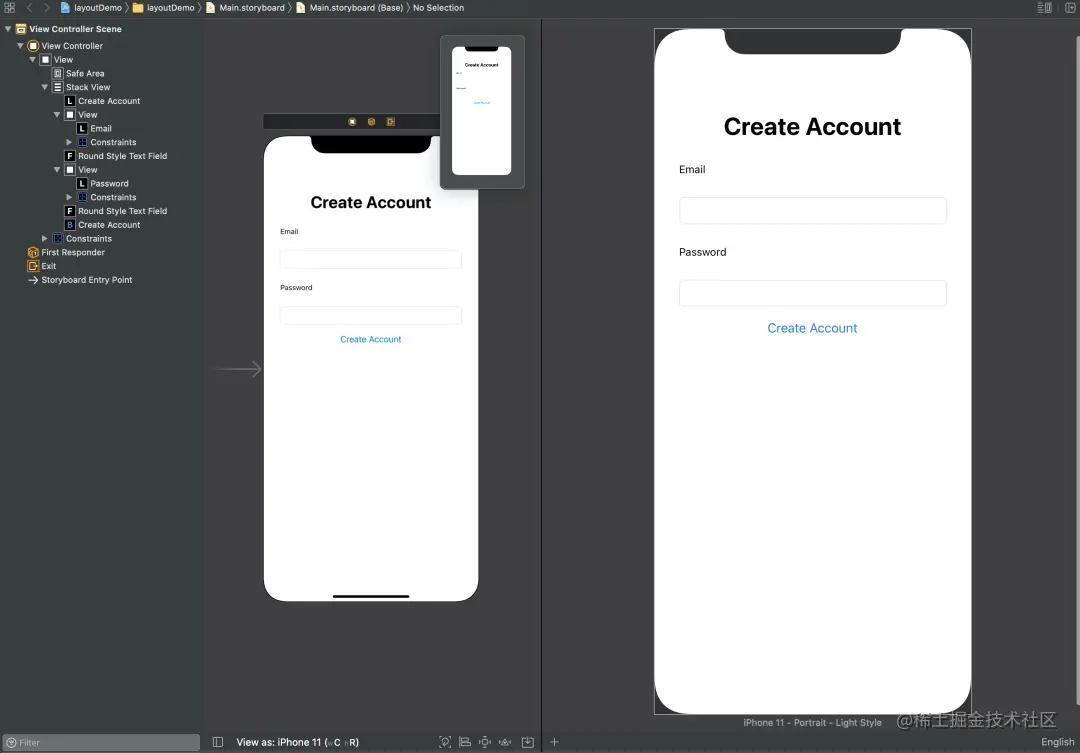 Document Preview 可以在多种屏幕尺寸、屏幕方向和语言条件下预览 Storyboard 布局的效果。 我们随便用 Storyboard 搭个界面: