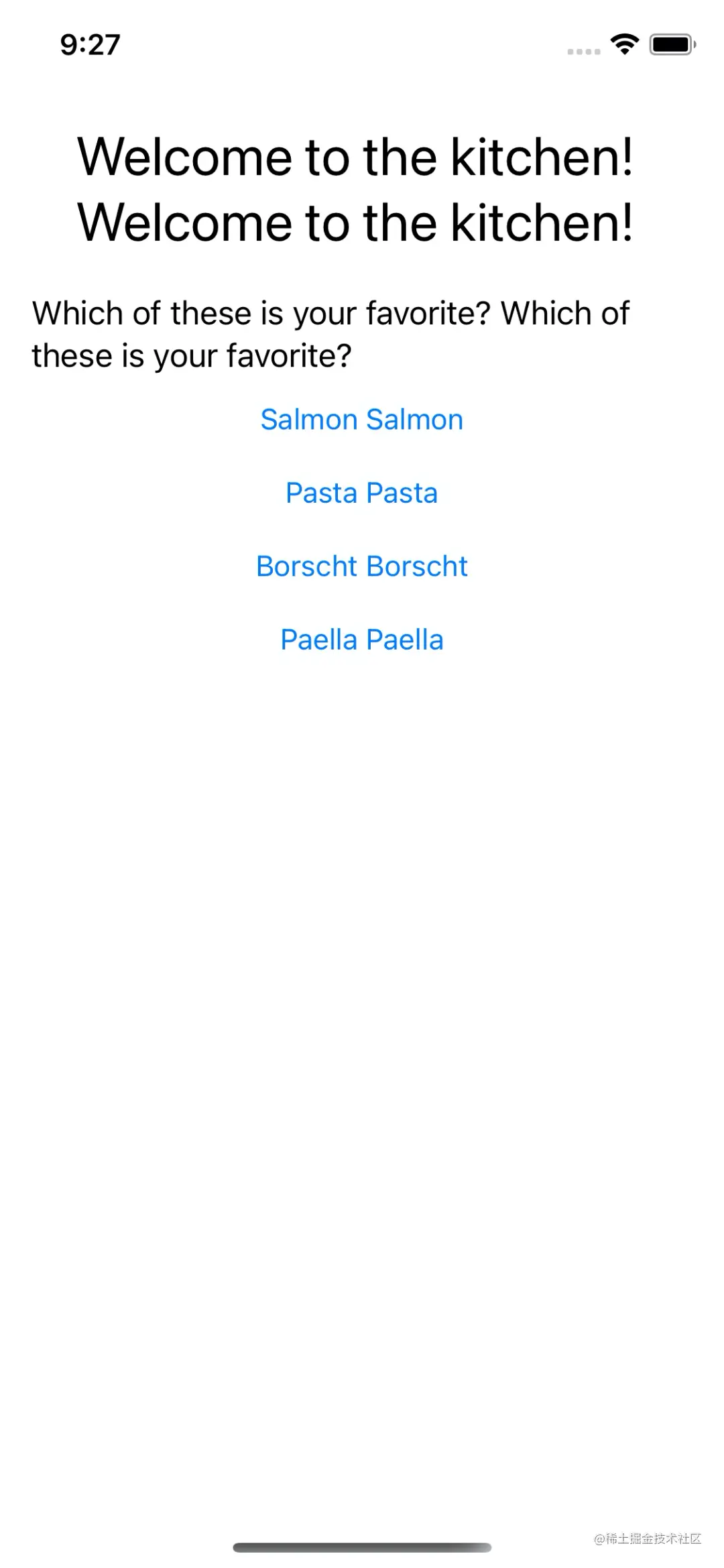 运行时 App 语言还可以设置为 Right-to-Left Pseudolanguage,可以模拟从右到左书写的语言,比如阿拉伯语、希伯来语。苹果官方的设计规范要求,当界面语言为从右到左语言时,整个界面布局需要左右镜像反转,原先左对齐的文本排版也要改为右对齐。这个伪语言选项在调试从右到左语言适配效果时非常有用。我们用这个选项把第一个 Demo 跑起来试一试: