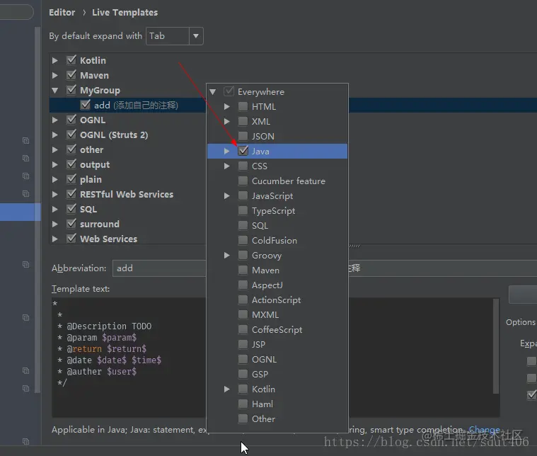 8.选择相对应的方法就可以了,点击ok,ok(注意这里使用的是tab的方式使用注释模板)