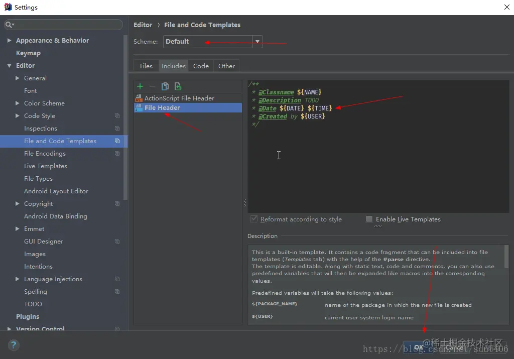 1.按照顺序打开 File->settings->File and Code Templates->Includes