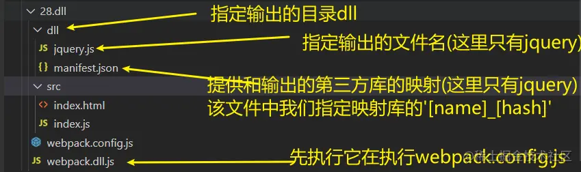 webpack.dll.js文件,这是希望将来在构建的时候不用重复打包某个库(这里的场景是不用重复打包jquery)的代码,因为我们在执行webpack --config webpack.dll.js指令之后生成了dll/jquery.js和dll/manifest.json。