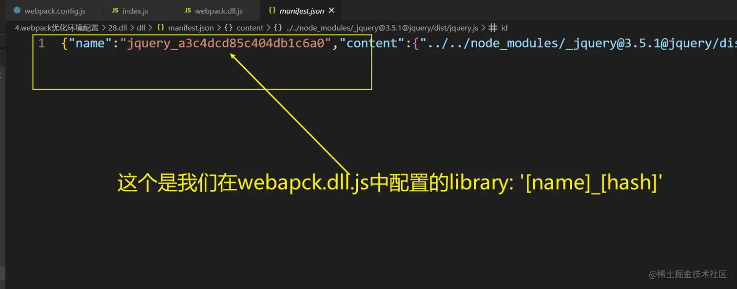 webpack.dll.js文件中只有针对jquery做了相应的配置,所以在执行webpack --config webpack.dll.js指令后,只会自动帮我们构建了dll目录,该目录下有jquery.js(即jquery的代码被整合到这个文件),还有manifest.json(即提供和库的映射关系这里只有jQuery),我们点开manifest.json文件,可以观察到如下: