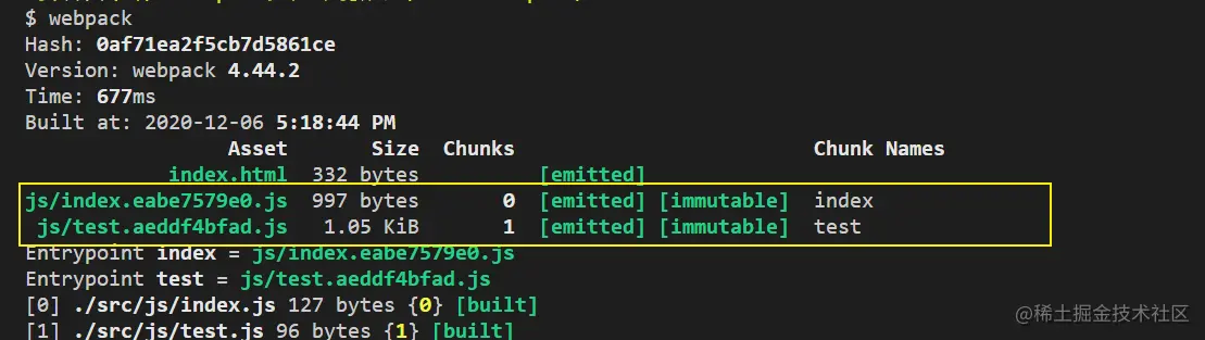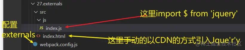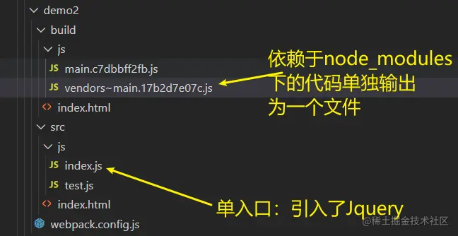 src/index.js中引入node_modules下的第三方库jQuery为例即(import $ from 'jquery';),我们想要使用dll技术,在执行webpack指令后,构建后的JS文件(这里只有输出一个JS文件因为是单入口)不要去引入Jquery代码,而是自动引入单独输出的第三方库文件。