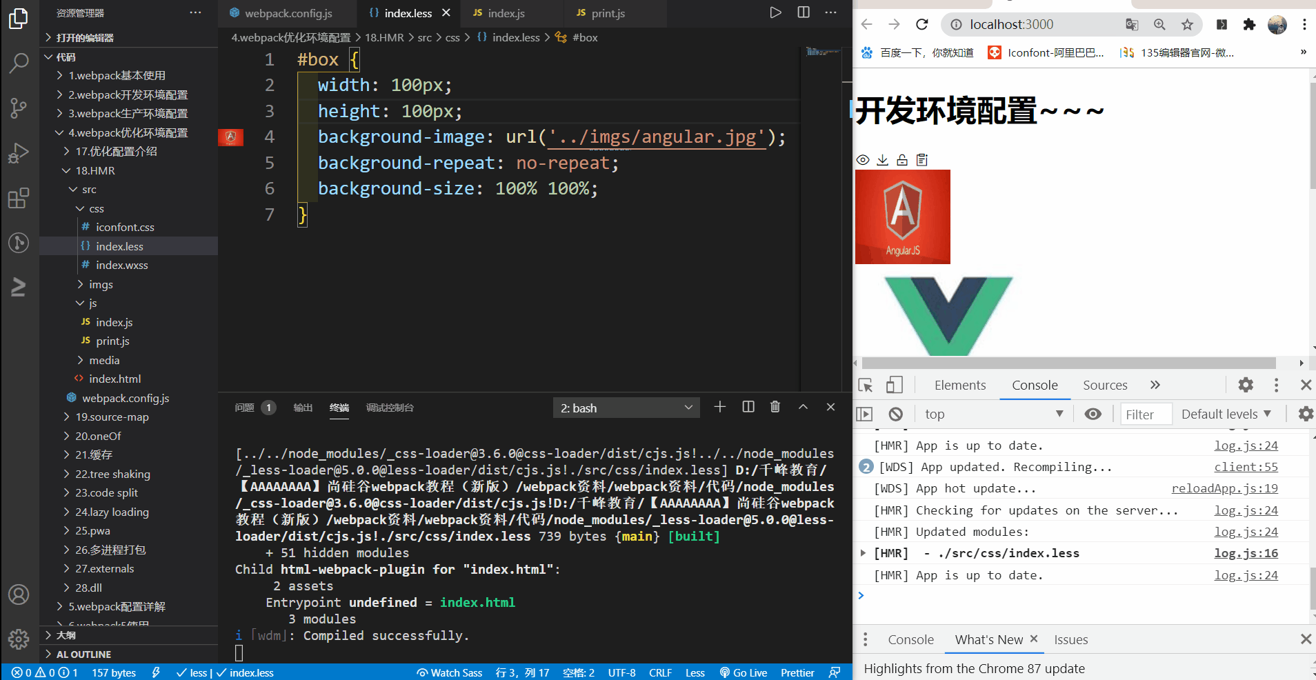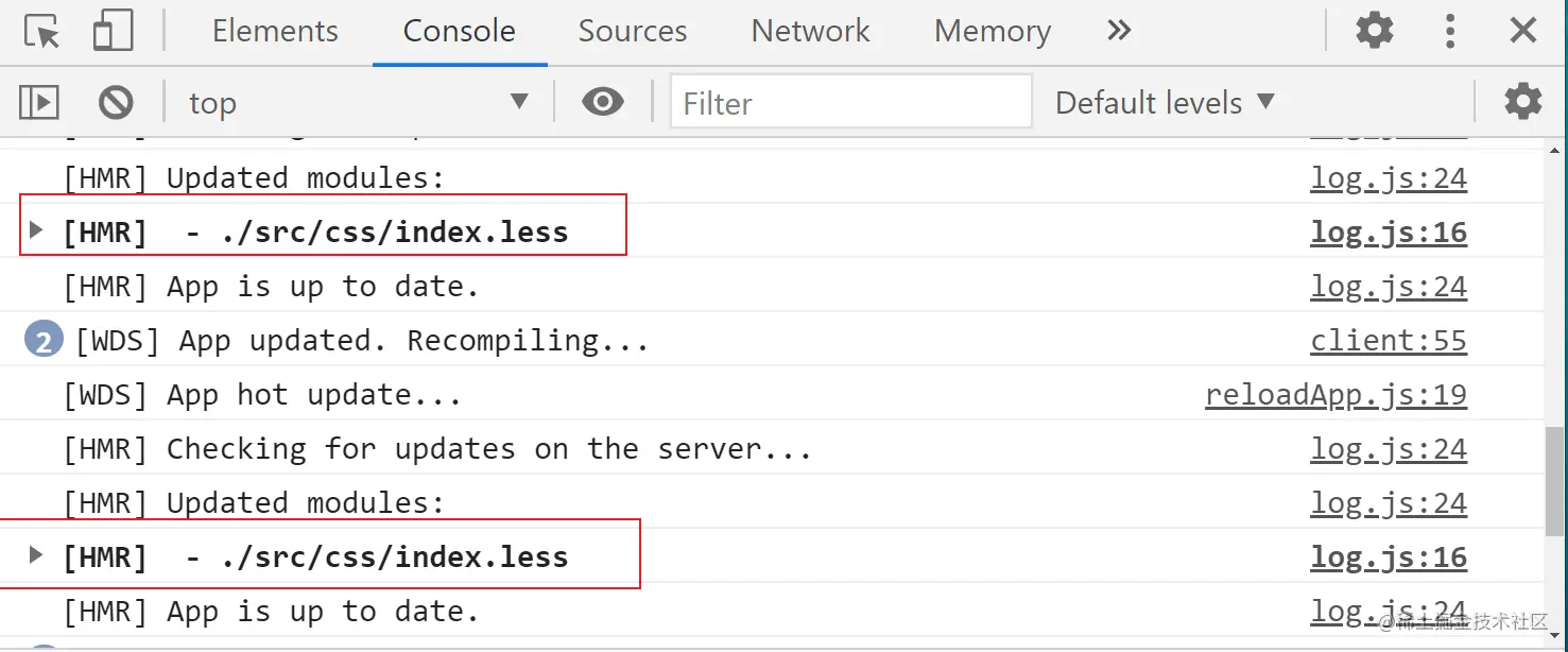 这里是修改src/css/index.less),我们在控制台上可以发现此时只有该样式文件被重新加载刷新了,其他的文件模块不受影响。