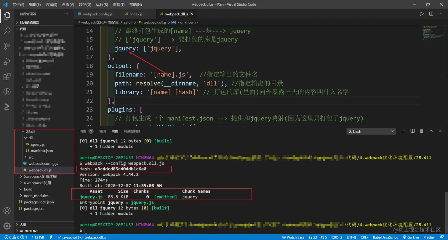webpack.config.js配置文件,但是我们现在的需求是在配置完webpack.dll.js后需要运行该文件,因为只有先运行该文件后,才能让我们配置的先单独输出的第三方库文件输出出去(即这里是先单独输出jquery.js文件)。