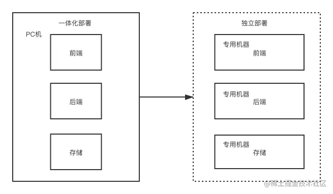 随着接入用户越来越多,我的一个个大胆的想法也付诸实践,招了几个村里的大学生做开发,加入了购物车、支付、快递等功能,开发团队也越来越大。在此期间,我赶时髦做了前端、后端、数据库应用独立部署。这个时期的服务架构简单而单纯,职责分明且条理清晰,遇到性能不足就加CPU加硬盘加内存,但是单机性能瓶颈的隐患也在逐步出现。