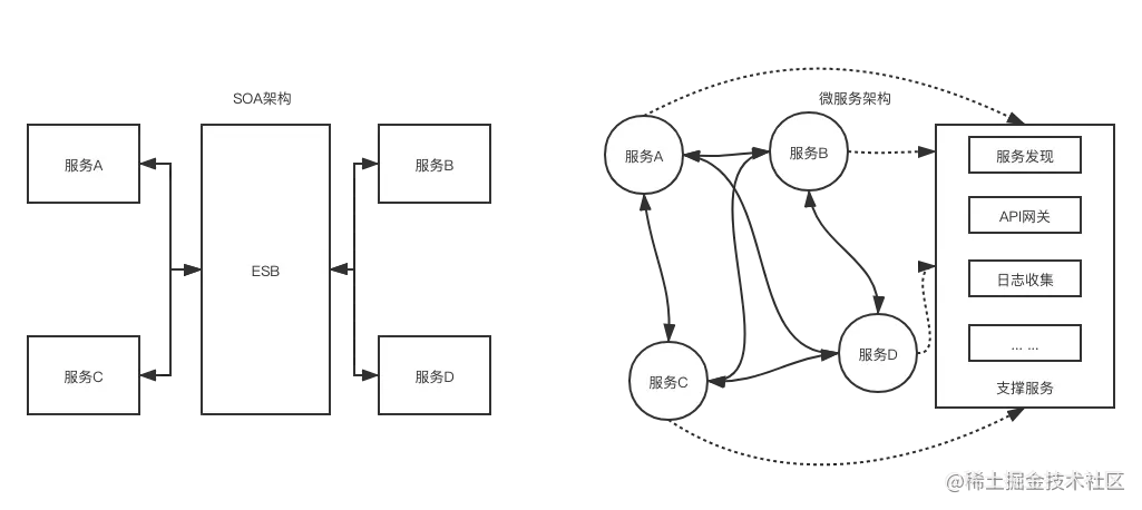SOA已经有了一定的微服务雏形,我个人也一直认为微服务是SOA随着软硬件技术发展的天然延伸。SOA跟微服务的一个显著区别,就是典型的SOA架构具有一个中心化的ESB(Enterprise Service Bus)企业服务总线,而微服务是去中心化的。什么是单体应用,原来住一个寝室的小伙伴,大家合作写一篇论文只要相互传阅就行了;毕业后大家各自成家,分布到五湖四海,这时候再想找大家帮忙,得通过邮寄了,这就是SOA。邮件要寄到谁那,需要他家的地址,而且可能他毕业后留洋多年把中文忘记了,邮件内容需要来回翻译,得有个专门的机构帮你做这些事情,这就是ESB。