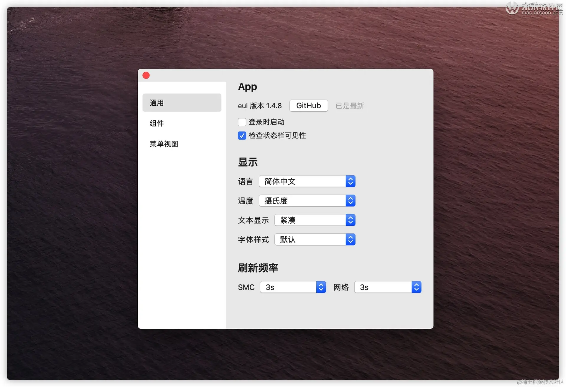 eul 1.4.1 是一款 mac 下的菜单栏监控软件,它可以在菜单栏直接显示 cpu资源、温度、转速、网速、硬盘存储等系统信息。