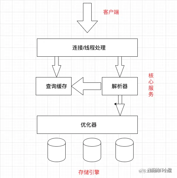 MySQL工作架构大致可以分为三层,最上面为客户端,比如:连接处理、授权认证、安全等功能都在这一层处理。