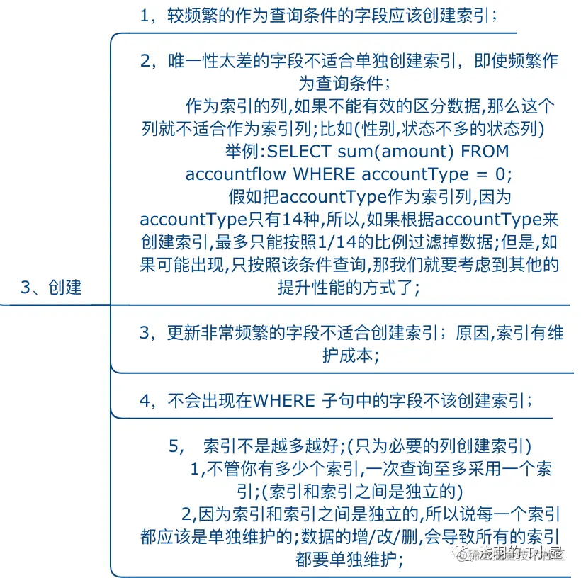尽量避免全表扫描,对where及orderby的列建立索引尽量避免where使用 != 或 <>尽量避免where子句用 or 连接条件乱用%导致全表扫描尽量避免where子句对字段进行表达式操作尽量避免where子句对字段进行函数操作覆盖查询,返回需要的字段优化嵌套查询,关联查询优于子查询组合索引或复合索引,最左索引原则用exist代替in当索引列有大量重复数据时,SQL查询可能不会去利用索引