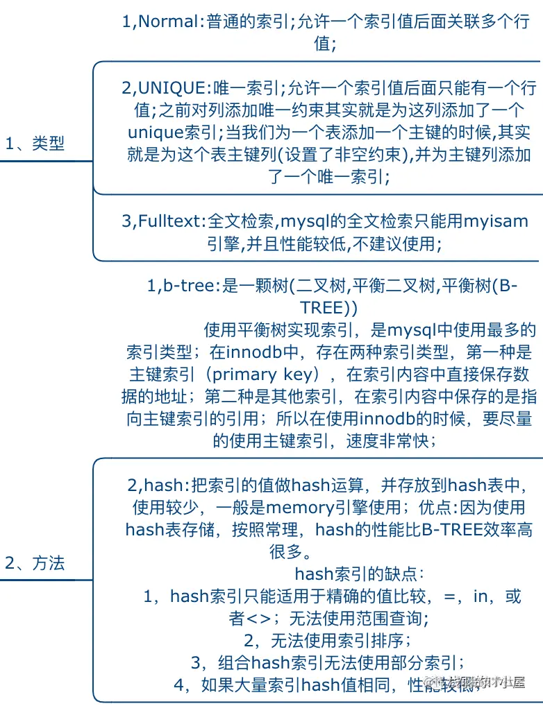 B-TREE索引:常见,大部分都支持HASH索引:只有memory引擎支持R-TREE索引:空间索引是MyISAM的一个特殊索引类型,主要用于地理空间数据类型full-text索引:全文索引,MyISAM的一个特殊索引类型,innodb从5.6开始支持