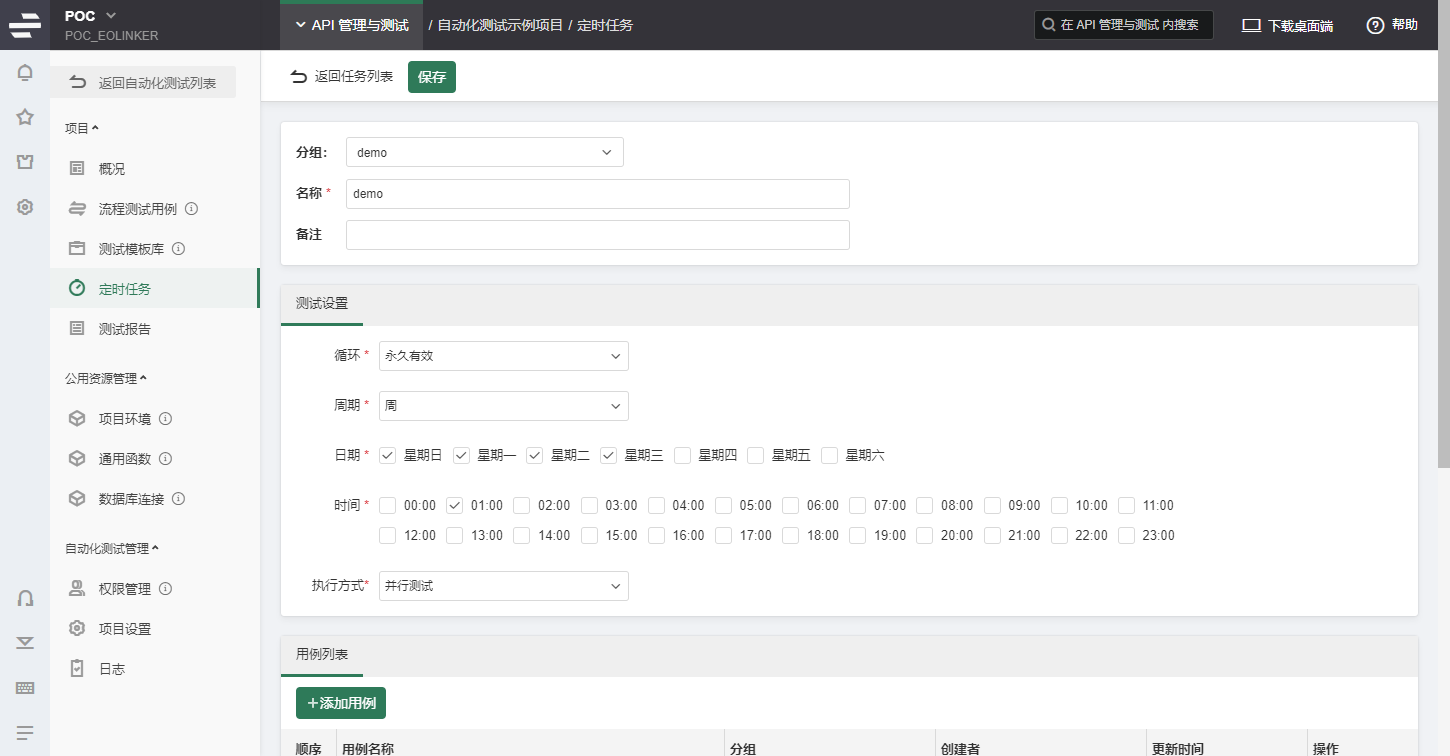 在编辑页中设置定时任务的名称、循环次数、周期等信息,然后设置需要定时测试的测试用例、测试的环境、测试完成后的通知方式等信息,点击保存即可。