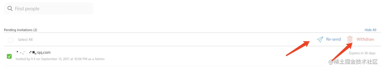 六、在对方没有接受邀请之前,你可以选择撤销邀请withdraw;或者对方没有收到邀请的邮件,可以重新发送邀请re-send: