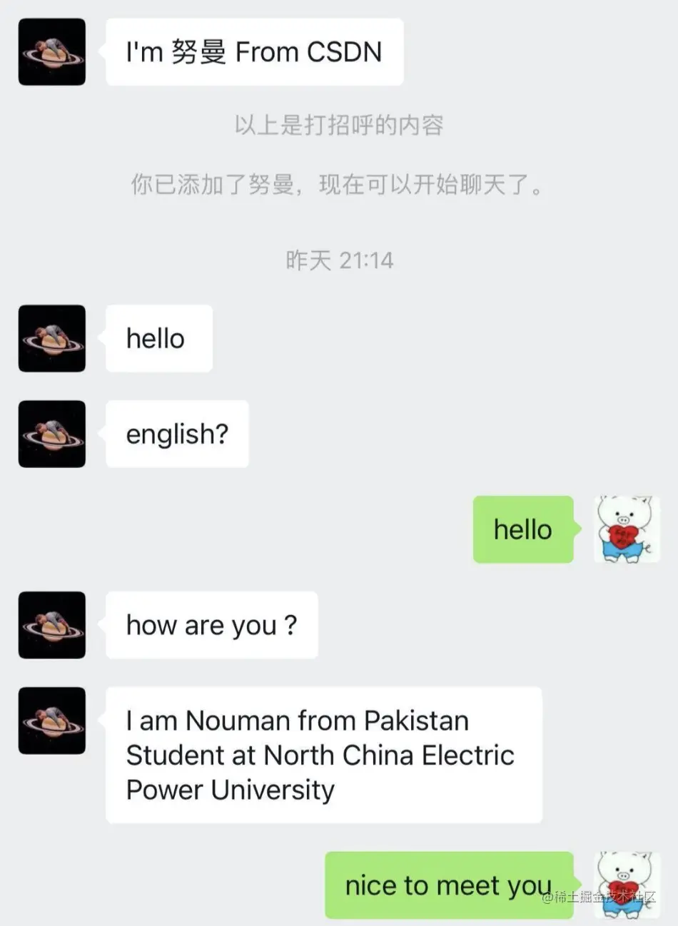 随后又收到一句 “english?”,还以为有朋友在逗着玩。直到对方介绍了自己,原来是巴铁兄弟啊。于是,就拿是自己都不知道对错的英语与对方聊了四十分钟,真是在寒风中瑟瑟发抖。