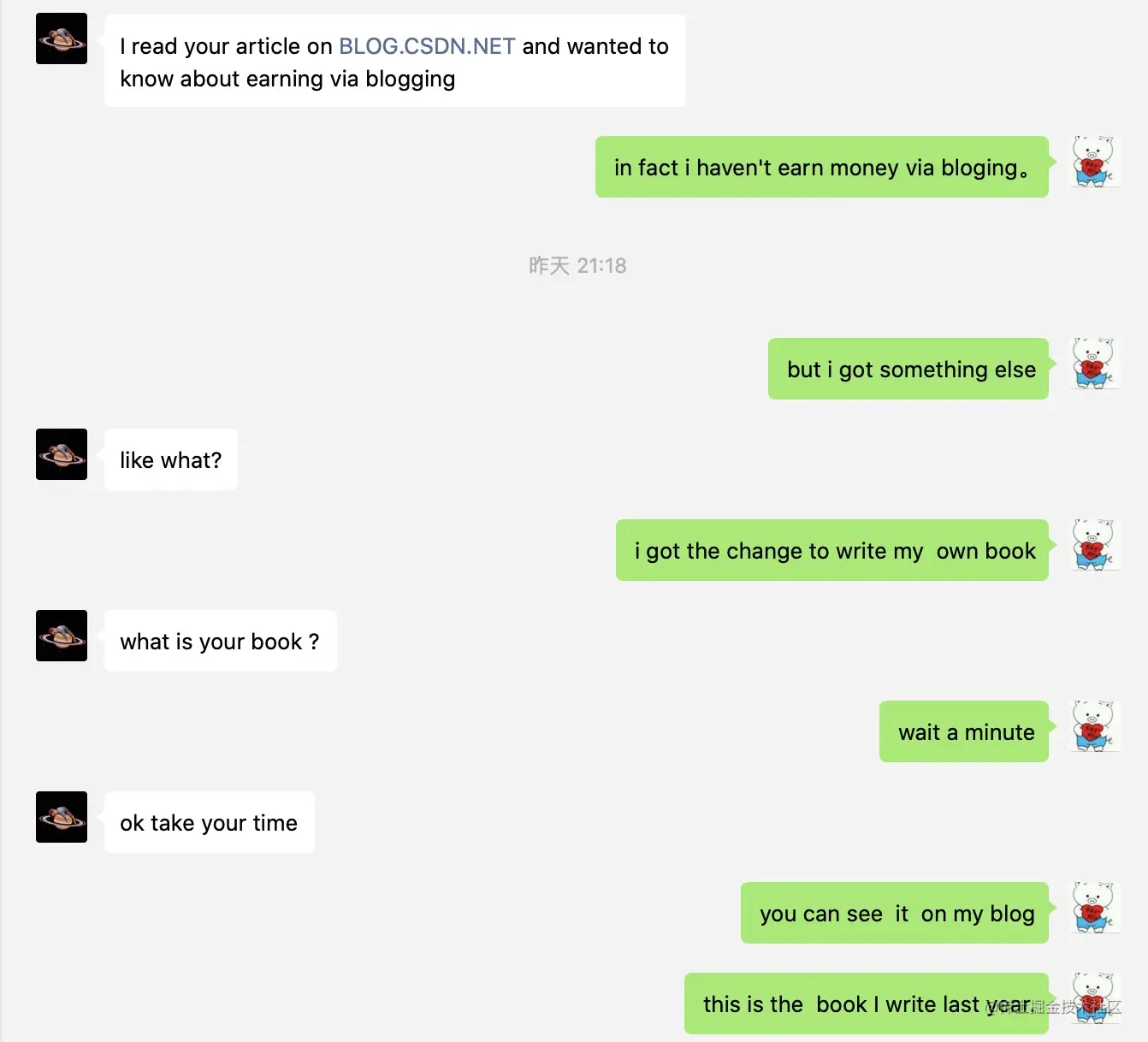 下面,就随着与努曼的聊天,聊聊写博客到底能不能赚钱。当努曼说,想通过写博客赚钱时,回答他的第一句话就是 “我并没有通过博客赚到钱”。