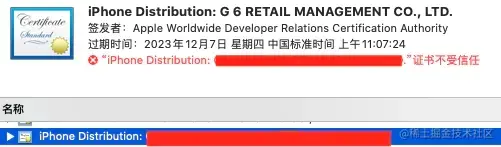 今天Xcode打包时报错,查到log发现问题是签名不受信任。感觉很迷惑,开发证书,描述文件做成手顺都没问题呀,为什么不受信任呢?公钥也没有过期,用同事的公钥然后让他给我导出.p12文件安装仍然显示证书不受信任。😭