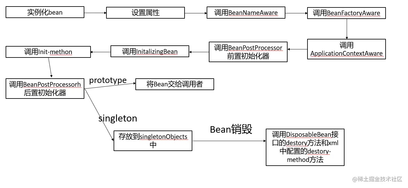 - 对于⾮懒加载的bean,getBean的时候会从缓存⾥头获取,因为容器初始化阶段 Bean 已经初始化完成并缓存了起来