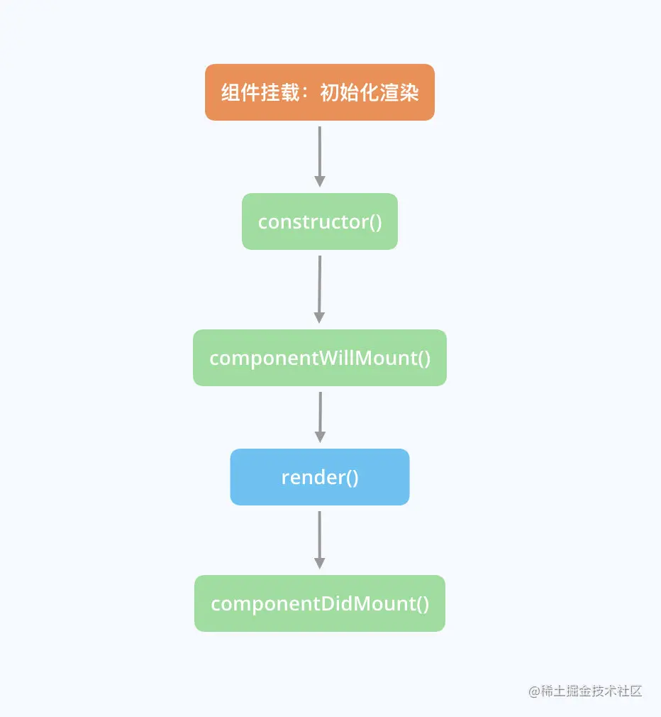 组件挂载在一个 React 组件的生命周期中只会发生一次,在这个过程中,组件被初始化,最后被渲染到真实 DOM;