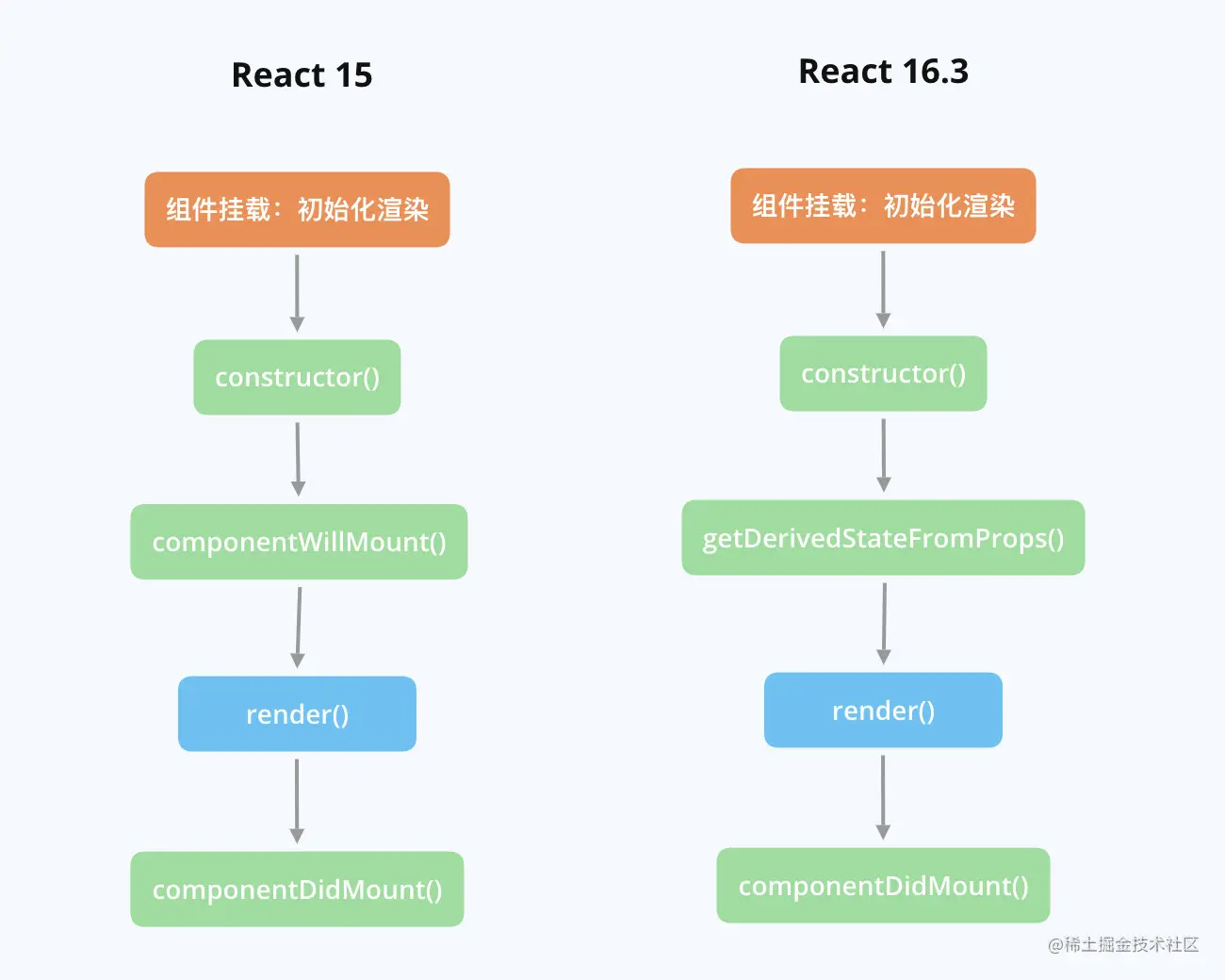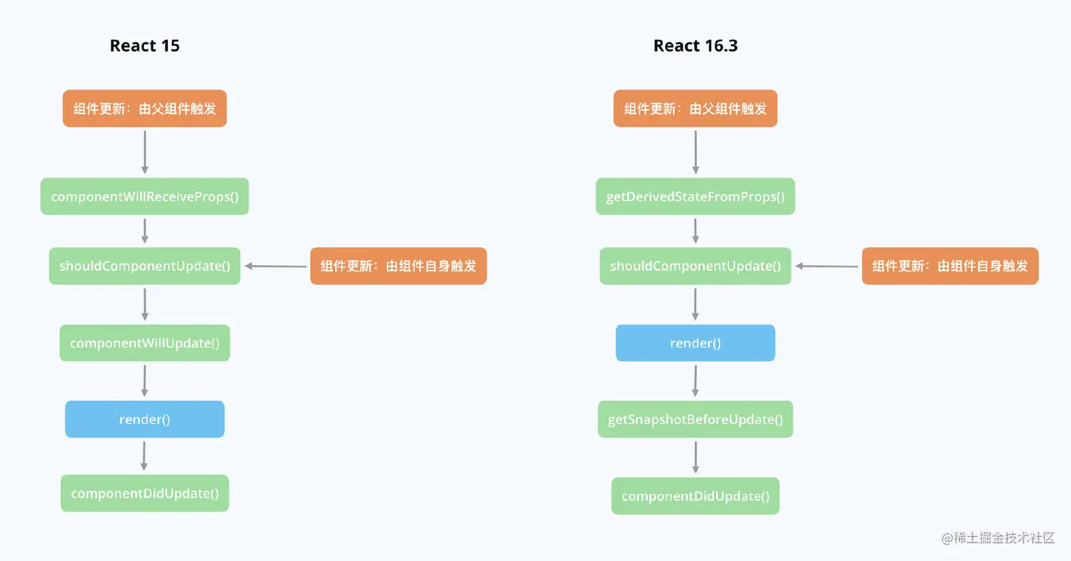 这里通过对 React15 和 React16 两个版本的生命周期进行对比总结,来建立系统而完善的生命周期知识体系
