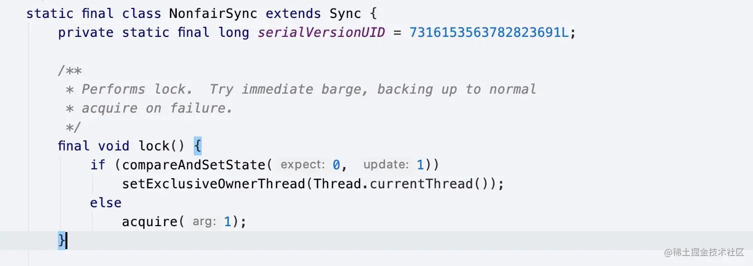*3.acquire(1)是AQS中的模板,里面有个钩子tryAcquire(args)让子类去实现
