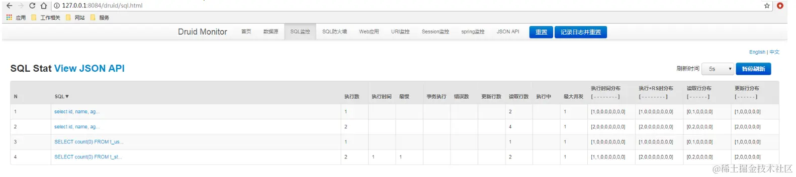 查询完毕之后,我们再来看Druid 的监控界面。在浏览器输入:http://127.0.0.1:8084/druid/index.html