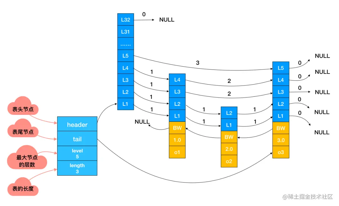 下面这张是跳表真实的存储结构,和其它数据结构一样,都在头节点里记录了相应的信息,减少了一些不必要的系统开销。