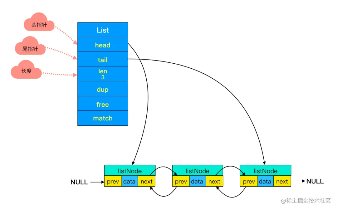 头节点里同时还有一个参数 len,和上边提到的 SDS 里类似,这里是用来记录链表长度的。因此获取链表长度时不用再遍历整个链表,直接拿到 len 值就可以了,这个时间复杂度是 O(1)。