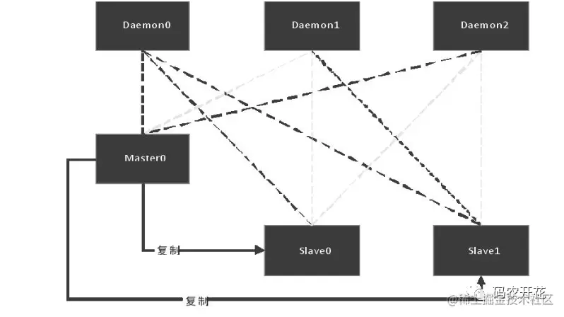 Redis Sentinel 是社区版本推出的原生高可用解决方案。由一或多个哨兵实例监视任意个主从服务器,且在 Master 宕机时,自动将宕机服务器属下的 Slave 服务器升级为 主服务器,从而保证系统的可用性。较主从实现的监控、选主。但问题主要是要保证 Master 的 HA 切换。结构图如下: