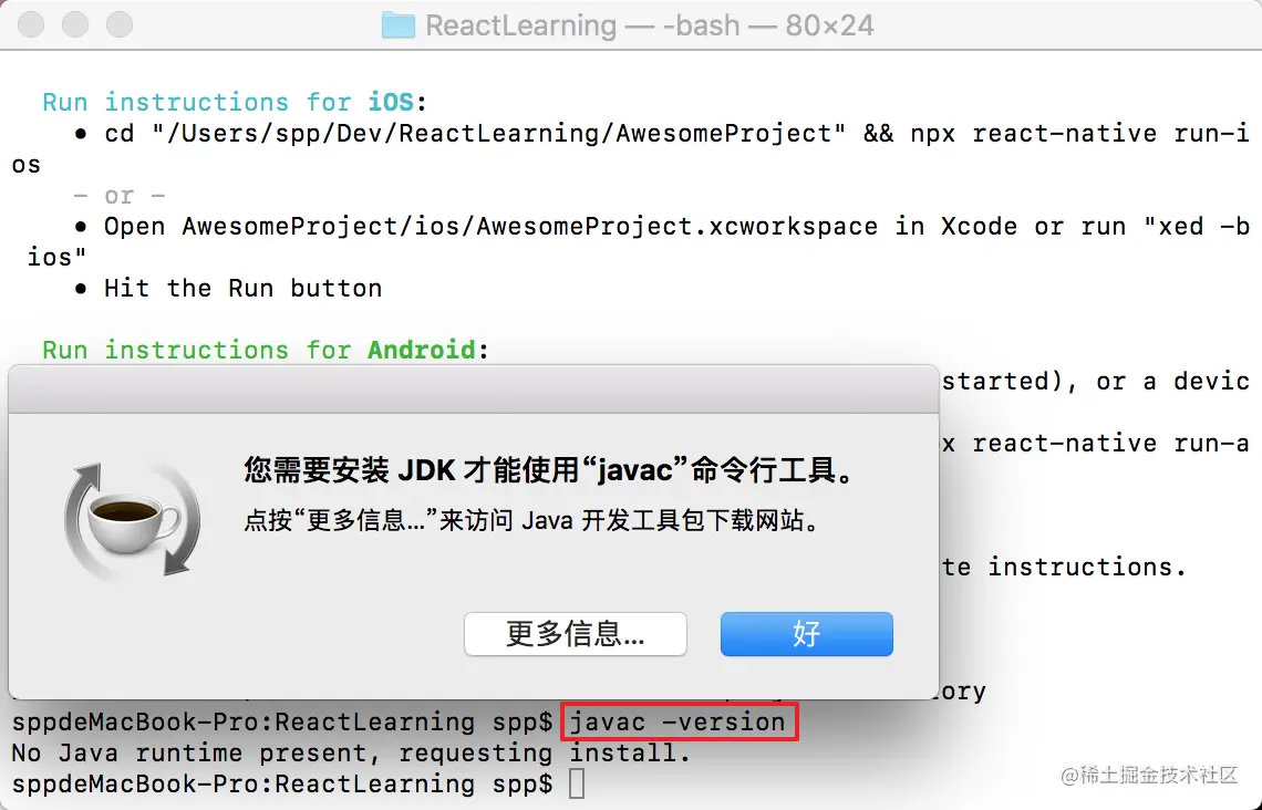 为什么要在mac上安装JDK?因为 React Native 需要 Java Development Kit [JDK] 1.8(暂不支持 1.9 及更高版本,注意 1.8 版本官方也直接称 8 版本)