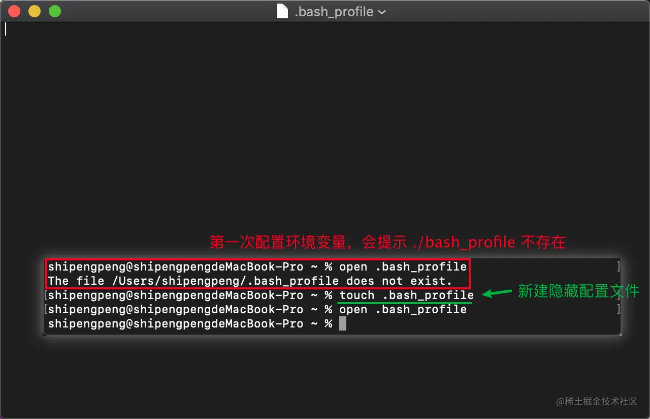 open .bash_profile打开.bash_profile文件并编辑,如果是第一次配置环境变量,会报.bash_profile文件不存在,如果是第一次配置环境变量,需要新建一个.bash_profile环境变量配置文件 -