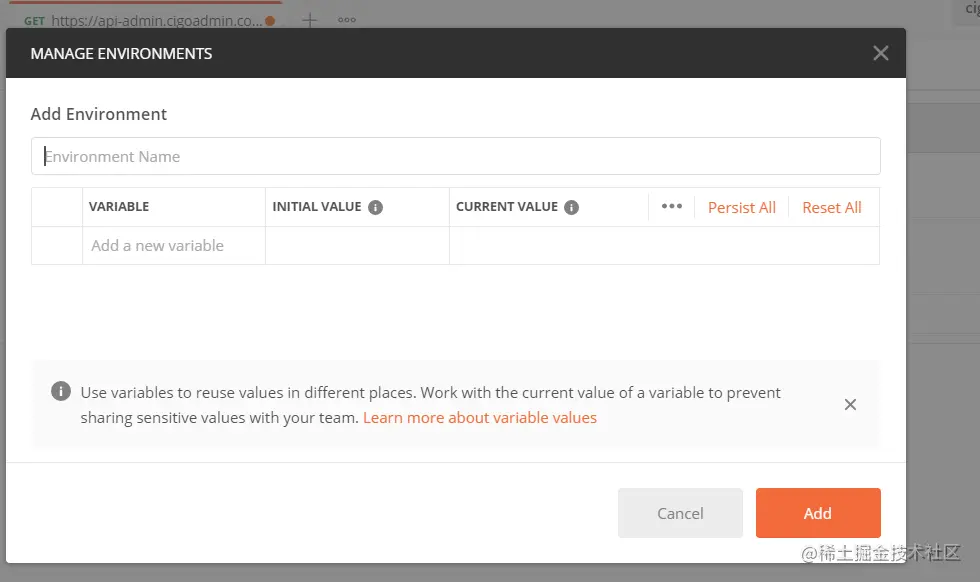 可以直接在里面增加变量,当然也可以在下拉框那里选好作用域,然后点击眼睛按钮,在里面增加变量,然后即可在该作用域下使用这个变量了,如上图所示的 url ,使用时只需要用双大括号括住,把变量放进去即可。这样的话,我们只需要在里面增加三个变量,url,testurl,onlineurl分别代表着开发,测试和线上环境,我们测试的时候只需要稍微修改一下即可。