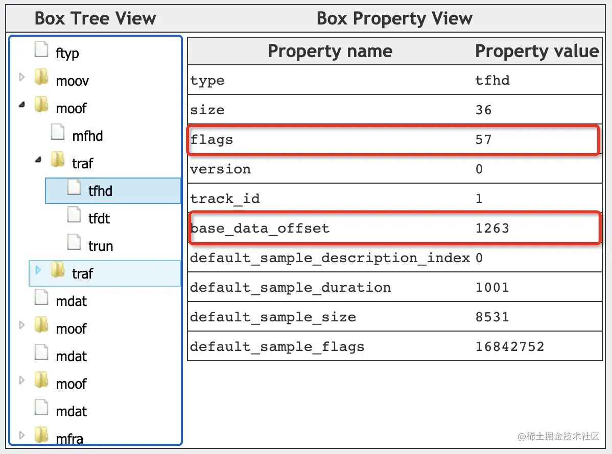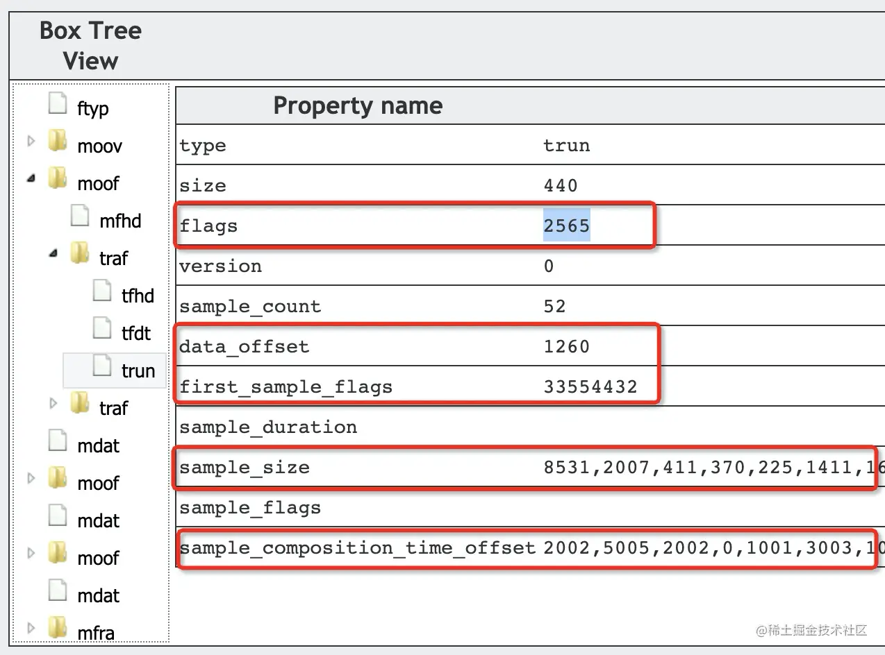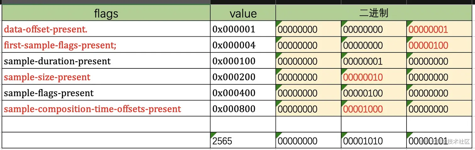 举例如下,tr_flags 为 2565。此时,存在 data_offset 、first_sample_flags、sample_size、sample_composition_time_offset。