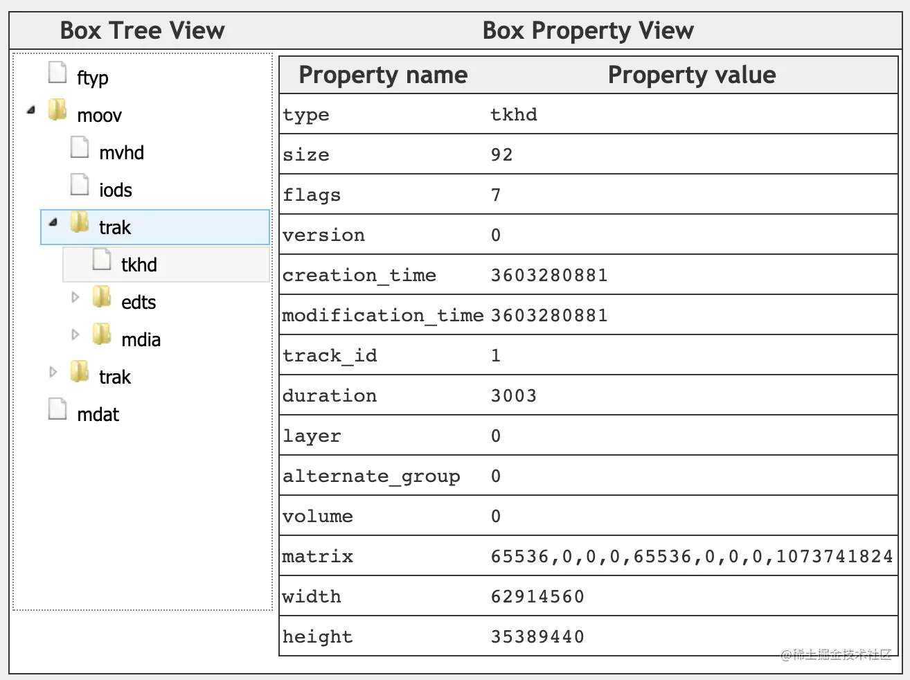 - mvhd:Movie Header Box,mp4文件的整体信息,比如创建时间、文件时长等;