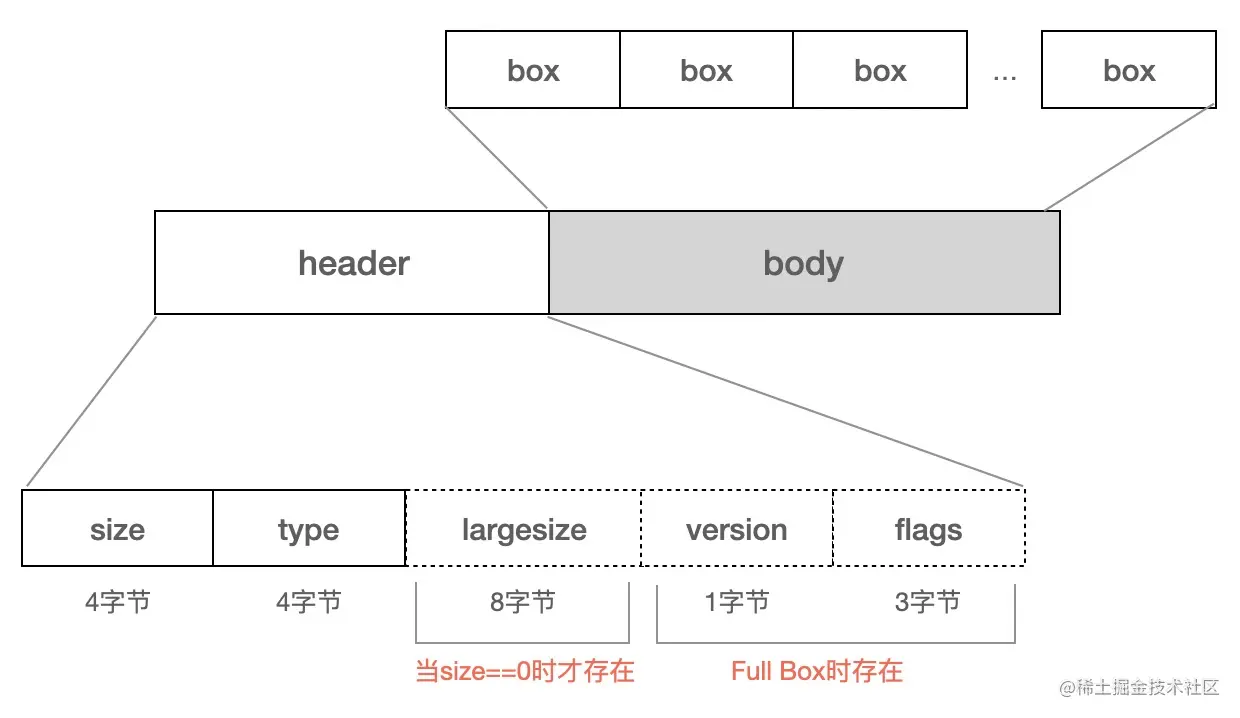 box header中,只有type、size是必选字段。当size==0时,存在largesize字段。在部分box中,还存在version、flags字段,这样的box叫做Full Box。当box body中嵌套其他box时,这样的box叫做container box。