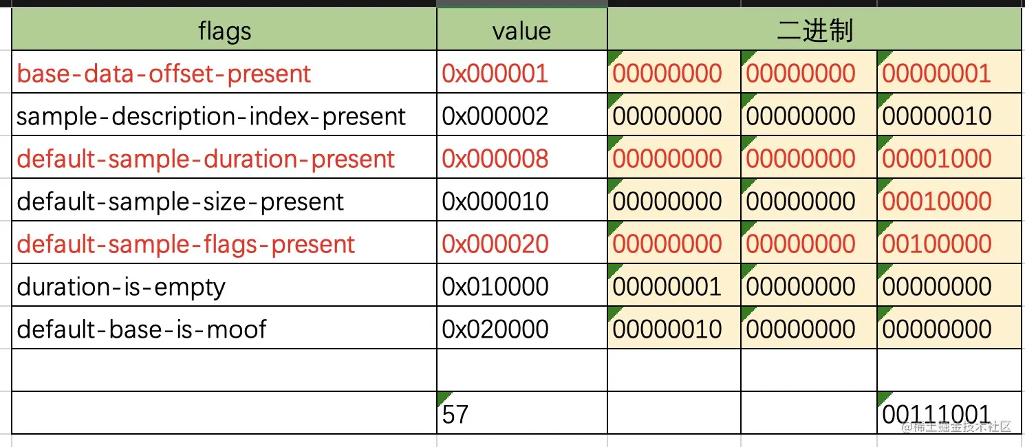 0x000004 first‐sample‐flags‐present:存在 first_sample_flags 字段,这个字段的值,只会覆盖第一个 sample 的flag设置;当 first_sample_flags 存在时,sample_flags 则不存在;