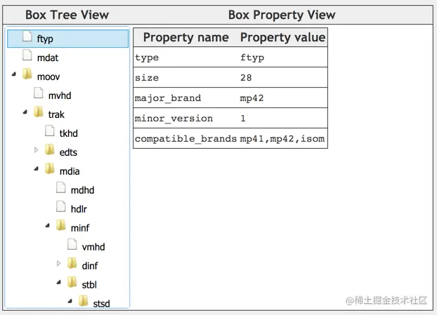 box数据体,不同box包含的内容不同,需要参考具体box的定义。有的 box body 很简单,比如 ftyp。有的 box 比较复杂,可能嵌套了其他box,比如moov。
