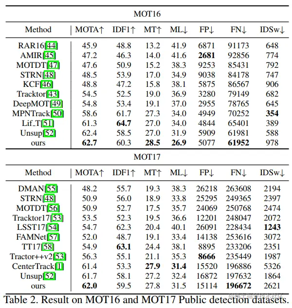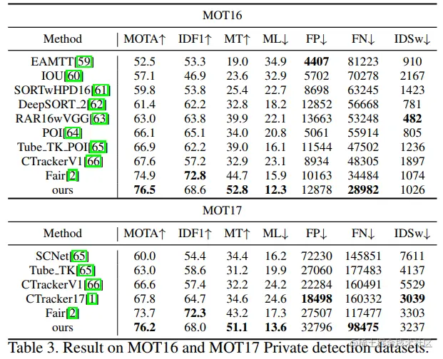 检测部分采用 FairMOT 的检测结果,也就是采用 CenterNet 作为检测器。特征提取部分,文章使用 ResNet101-FPN 作为 backbone,在 COCO 上预训练过,然后在 MOT 数据集上 fine tune 30 轮。其他训练细节可以自行查阅论文,我这里就不多说了,在 Public 和 private 两个赛道进行了测试,结果分别如下,超越了之前的 SOTA 方法如 FairMOT 等,精度突破很大,速度比较慢。