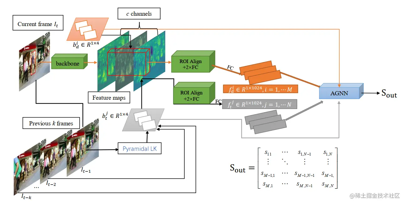 上面的叙述有个容易误解的地方,它将过去一帧预测的 bbox 和历史帧的非预测的 bbox 都在当前特征图上提取了特征,事实上,不是的,一来实际上,帧的特征在处理帧的时候已经重提取过了,在当前帧上用当时的 bbox 提取肯定存在严重的不对齐问题;二来,这样会大大加大网络计算的复杂性,完全没有必要。论文这个图画的稍微有些让人误解,等开源后可以再细细研究。