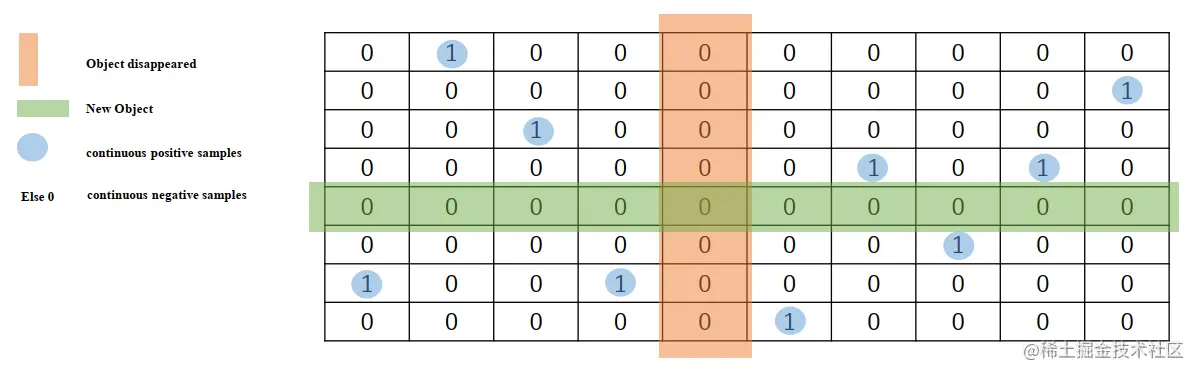 得到最终的相似度矩阵就可以进行监督训练了,不过 GT 的标签为相同目标为 1,不同的目标为 0,下图是作者做的可视化,每行代表一个 detection,每列代表一个 tracklet,绿行表示 detection 没有匹配上任何 tracklet,所以是新目标;相对的,红列表示消失的目标。1 表示正例,0 表示负例,显然正负例严重不均衡,所以这里对 MSE 按照目标类型进行了加权(超参),如下式。