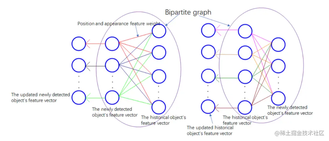 下面聊一聊这个自适应图神经网络。将 tracklets 和 detections 作为二分图处理不是什么新鲜的事情,但是用来聚合特征 TPAGT 应该是为数不多的工作,要知道此前我们聚合运动和外观特征只是人工设计的组合,作者这种借助图网络自适应聚合特征是很超前的思路。 每个检测目标和每个 tracklet 都是节点,如上图所示,detection 之间没有联系,tracklet 之间也没有联系,但是每个 tracklet 和每个 detection 之间都有连接。图网络的学习目的就是每个节点的状态嵌入,或者说聚合其他信息后的特征向量。最终,这个包含了邻居节点的信息。