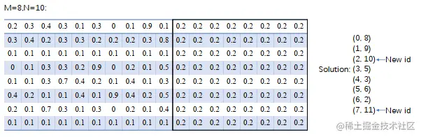 推理时,我们会得到相似度矩阵,那么如何利用这个矩阵呢?假设有个 detection 和个 tracklet,矩阵就是的,此时在后面补充一个的增广矩阵,矩阵中每个值都是一个阈值,如下图,匈牙利算法就成了带筛选的匹配方法,下图由于第 3 行和第 8 行没有高于阈值(0.2)的相似度,所以成为了新目标。